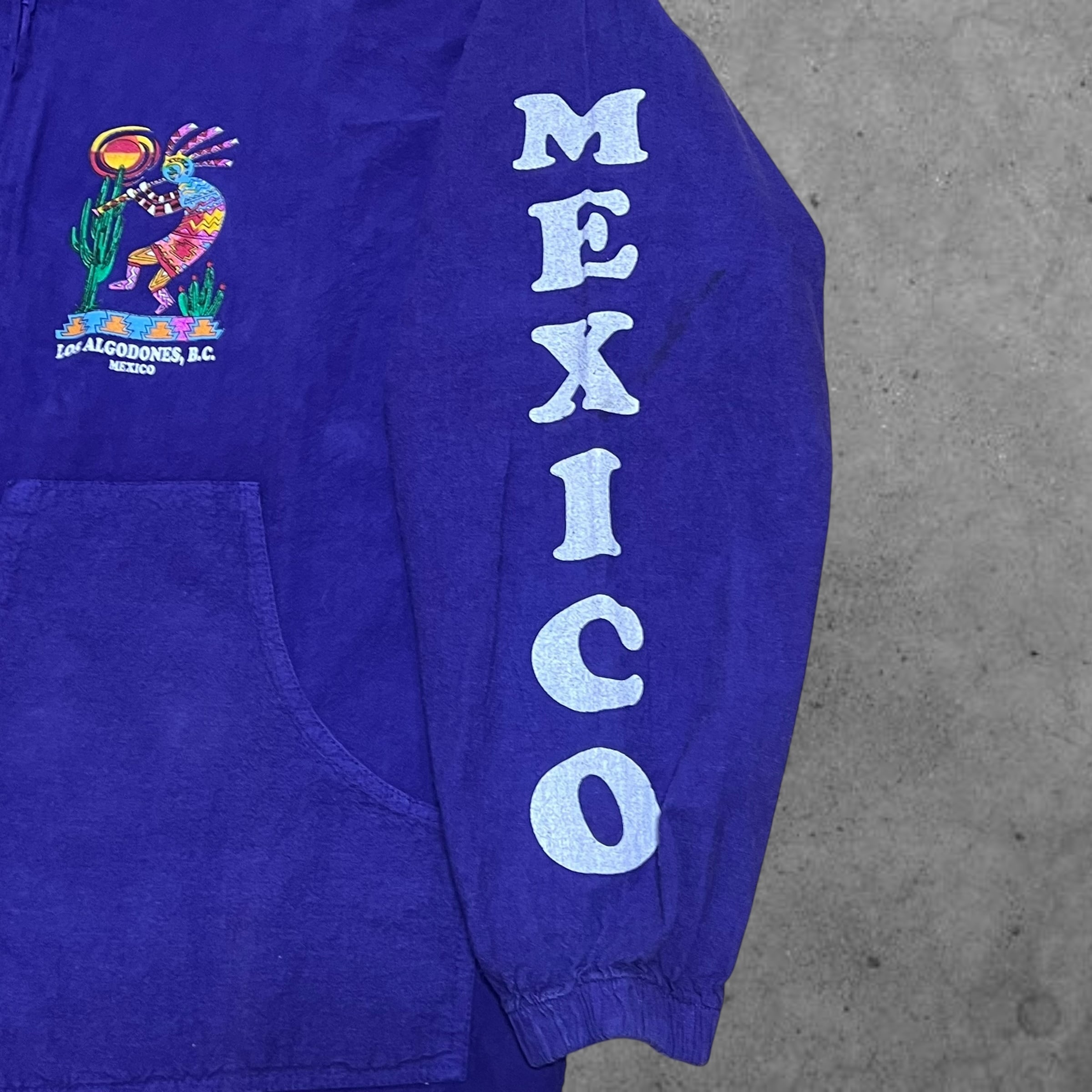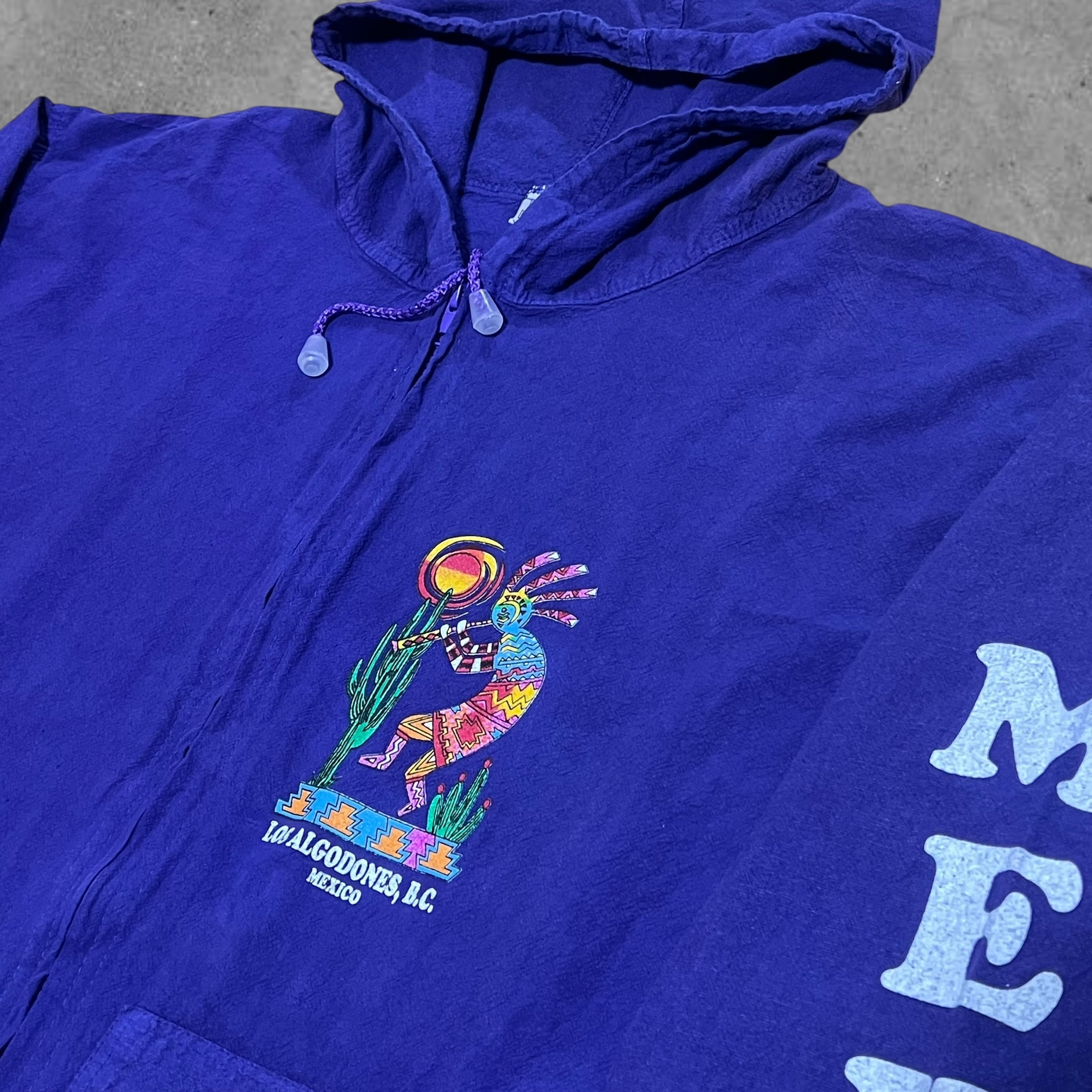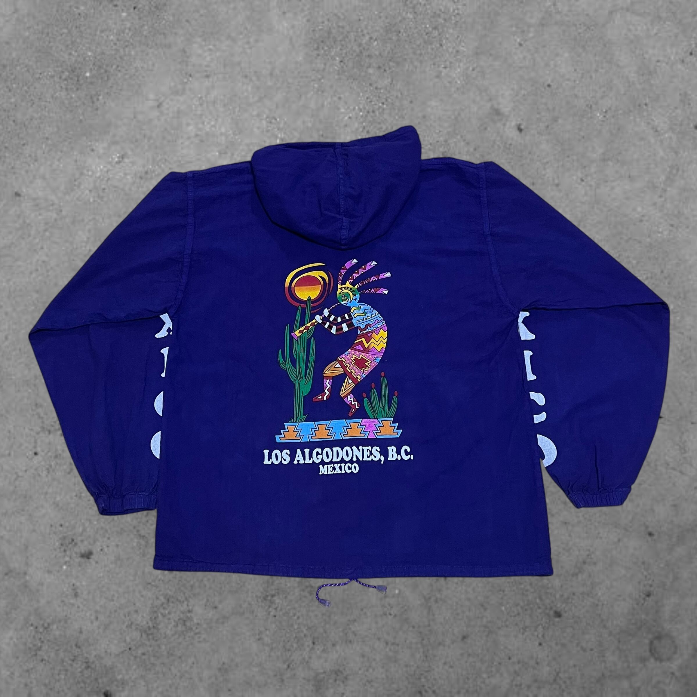 kokopelli(ココペリ)とは、南アメリカ地方に伝わるネイティブアメリカンの精霊のひとり。 「ココペリが笛を吹くと、地面から緑が吹き出し、花が咲き乱れ、木々は生い茂り、動物たちは次々と子どもを産み落とす。」 という言い伝えがあります。そんなメキシカンな精霊を贅沢にプリントしスリーブには無骨さ極まるMexicoプリントが施された貴重な一点です。近年流行りの短丈にも対応できる裾コード付きも魅力的です。アメカジ、スケーター、ストリートが好きな方には他の人と差がつけれるものとしてオススメです‼︎